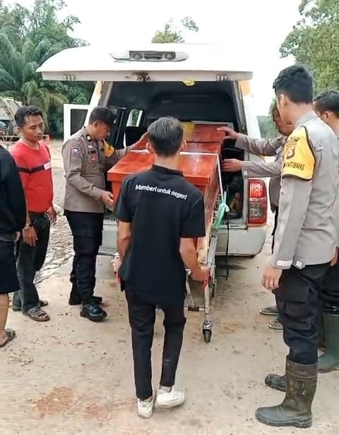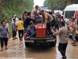 Dengan dibantu personel Polsek BTS Ulu, proses pemindahan jenazah dilakukan secara manual agar dapat melewati lokasi banjir dengan aman dan lancar.